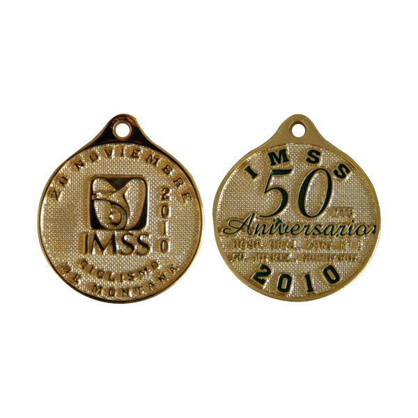 Medalla vaciada dorada a color. Tamaño 4 – 5 cm. Pedido min. 100 pz. Colores agregar $1.00 por tinta.